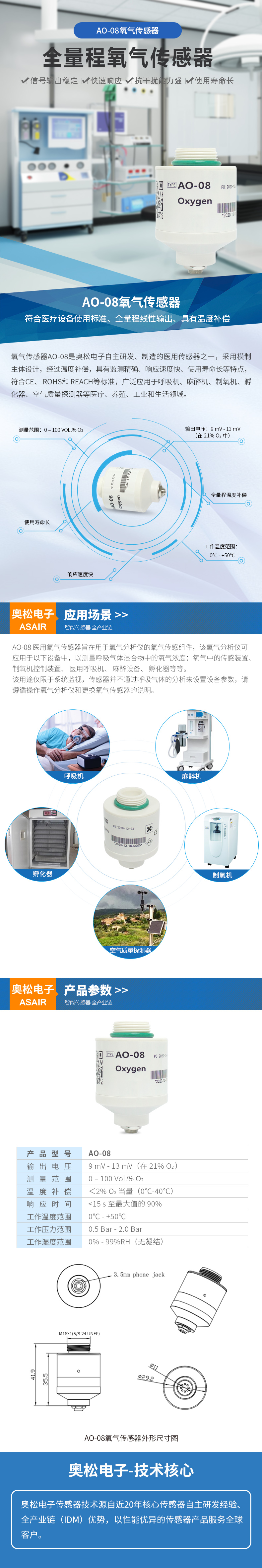 AO-08 是奧松電子的醫(yī)用氧氣傳感器。高品質(zhì)的 AO-08 氧氣傳感器具有長壽命和快速響應(yīng)的特點,并采用了模制主體設(shè)計,專門用于醫(yī)療設(shè)備。AO-08 的成本低于其更換的傳感器,從而在節(jié)省成本的同時提供了卓越的質(zhì)量。