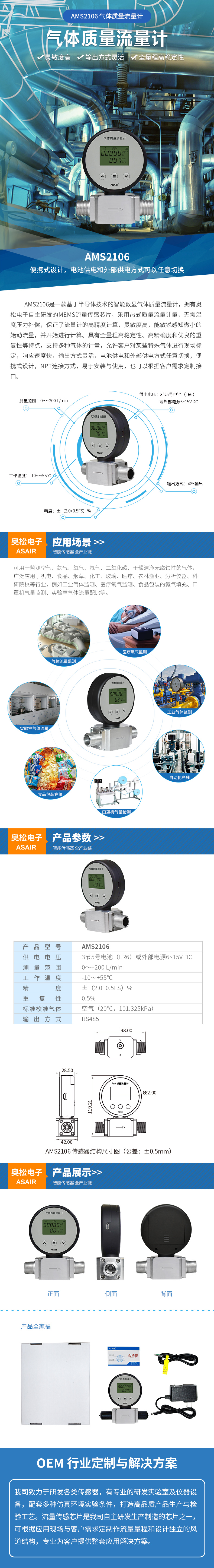 AMS2106是一款基于半導體技術的智能數顯氣體質量流量計,擁有奧松自主研發的MEMS流量傳感芯片,采用熱質量流量計量,無需溫度壓力補償,保證了流量計的高精度計算,靈敏度高,能敏銳感知極小的始動流量,并開始進行計算。具有全量程高穩定性、高精確度和優良的重復性等特點,支持多種氣體的測量,允許客戶對某些特殊氣體進行現場標定,響應速度快,輸出方式靈活,具備超量程報警指示功能,電池供電和外部供電方式任意切換,便攜式設計,NPT連接方式,易于安裝與使用,也可以根據客戶需求定制接口。