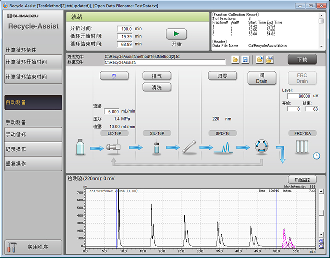 LC-16P輸液泵可以裝上選配的循環(huán)組件和循環(huán)閥,可實(shí)現(xiàn)閉合回路循環(huán)分離,且合適的低泵腔體積可以有效阻礙色譜柱以外的擴(kuò)散,以高效率、低成本、節(jié)能環(huán)保的方式顯著提升分離效果。通過使用Recycle-Assist循環(huán)助手軟件,從循環(huán)分離到餾分收集全程都可自動化進(jìn)行,實(shí)現(xiàn)操作方式簡易化、操作流程快捷化。