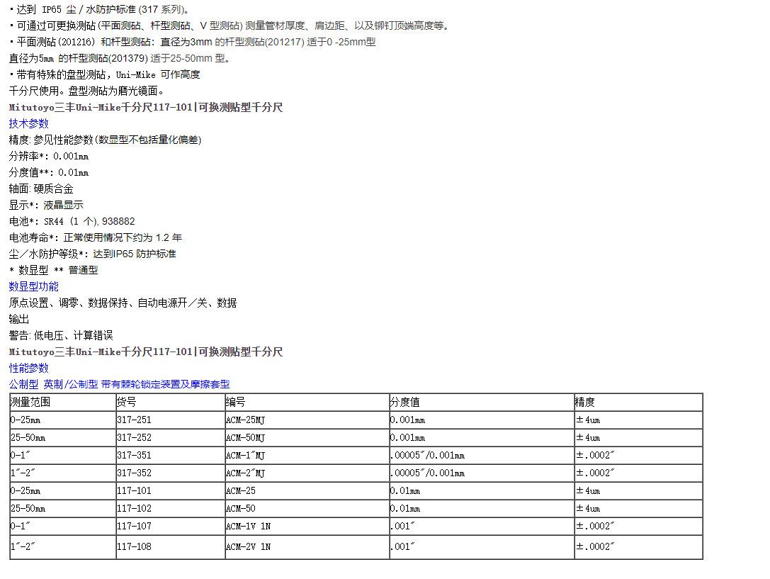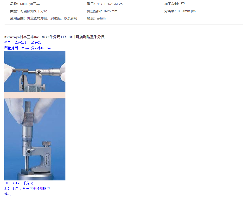 本網頁所展示的有關【三豐 Uni-Mike117-101千分尺|可換測貼型千分尺】的信息/圖片/參數等由的會員【日本三豐mitutoyo-深圳柏萊科技有限公司 】提供,由柏萊儀器網-專業銷售儀器儀表服務商-深圳柏萊科技有限公司會員【日本三豐mitutoyo-深圳柏萊科技有限公司 】自行對信息/圖片/參數等的真實性、準確性和合法性負責,本平臺(本網站)僅提供展示服務,請謹慎交易,因交易而產生的法律關系及法律糾紛由您自行協商解決,本平臺(本網站)對此不承擔任何責任。您在本網頁可以瀏覽【三豐 Uni-Mike117-101千分尺|可換測貼型千分尺】有關的信息/圖片/價格等及提供 【三豐 Uni-Mike117-101千分尺|可換測貼型千分尺】的商家公司簡介、聯系方式等信息。