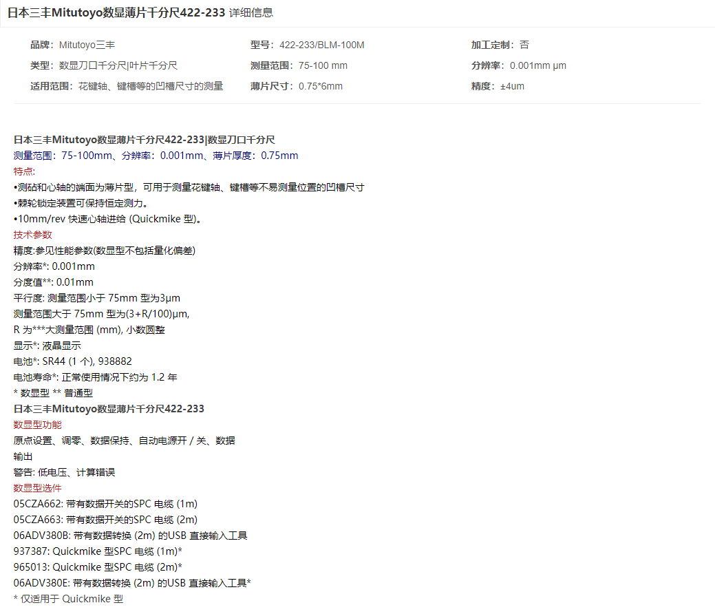 本網(wǎng)頁所展示的有關(guān)【三豐 422-233數(shù)顯薄片千分尺】的信息/圖片/參數(shù)等由的會(huì)員【日本三豐mitutoyo-深圳柏萊科技有限公司 】提供,由柏萊儀器網(wǎng)-專業(yè)銷售儀器儀表服務(wù)商-深圳柏萊科技有限公司會(huì)員【日本三豐mitutoyo-深圳柏萊科技有限公司 】自行對(duì)信息/圖片/參數(shù)等的真實(shí)性、準(zhǔn)確性和合法性負(fù)責(zé),本平臺(tái)(本網(wǎng)站)僅提供展示服務(wù),請(qǐng)謹(jǐn)慎交易,因交易而產(chǎn)生的法律關(guān)系及法律糾紛由您自行協(xié)商解決,本平臺(tái)(本網(wǎng)站)對(duì)此不承擔(dān)任何責(zé)任。您在本網(wǎng)頁可以瀏覽【三豐 422-233數(shù)顯薄片千分尺】有關(guān)的信息/圖片/價(jià)格等及提供 【三豐 422-233數(shù)顯薄片千分尺】的商家公司簡介、聯(lián)系方式等信息。