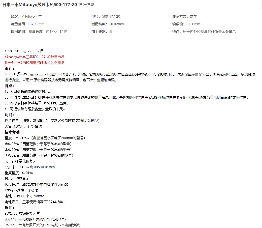 本網頁所展示的有關【三豐 500-177-20Mitutoyo數顯卡尺】的信息/圖片/參數等由的會員【日本三豐mitutoyo-深圳柏萊科技有限公司 】提供,由柏萊儀器網-專業(yè)銷售儀器儀表服務商-深圳柏萊科技有限公司會員【日本三豐mitutoyo-深圳柏萊科技有限公司 】自行對信息/圖片/參數等的真實性、準確性和合法性負責,本平臺(本網站)僅提供展示服務,請謹慎交易,因交易而產生的法律關系及法律糾紛由您自行協(xié)商解決,本平臺(本網站)對此不承擔任何責任。您在本網頁可以瀏覽【三豐 500-177-20Mitutoyo數顯卡尺】有關的信息/圖片/價格等及提供 【三豐 500-177-20Mitutoyo數顯卡尺】的商家公司簡介、聯系方式等信息。