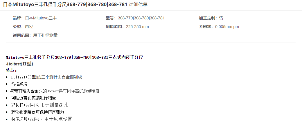 本網(wǎng)頁所展示的有關【三豐 368-779|368-780|368-781孔徑千分尺】的信息/圖片/參數(shù)等由的會員【日本三豐mitutoyo-深圳柏萊科技有限公司 】提供,由柏萊儀器網(wǎng)-專業(yè)銷售儀器儀表服務商-深圳柏萊科技有限公司會員【日本三豐mitutoyo-深圳柏萊科技有限公司 】自行對信息/圖片/參數(shù)等的真實性、準確性和合法性負責,本平臺(本網(wǎng)站)僅提供展示服務,請謹慎交易,因交易而產(chǎn)生的法律關系及法律糾紛由您自行協(xié)商解決,本平臺(本網(wǎng)站)對此不承擔任何責任。您在本網(wǎng)頁可以瀏覽【三豐 368-779|368-780|368-781孔徑千分尺】有關的信息/圖片/價格等及提供 【三豐 368-779|368-780|368-781孔徑千分尺】的商家公司簡介、聯(lián)系方式等信息。