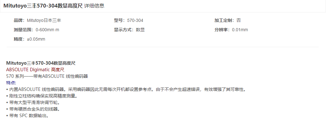 本網(wǎng)頁所展示的有關(guān)【三豐 570-304數(shù)顯高度尺】的信息/圖片/參數(shù)等由的會(huì)員【日本三豐mitutoyo-深圳柏萊科技有限公司 】提供,由柏萊儀器網(wǎng)-專業(yè)銷售儀器儀表服務(wù)商-深圳柏萊科技有限公司會(huì)員【日本三豐mitutoyo-深圳柏萊科技有限公司 】自行對信息/圖片/參數(shù)等的真實(shí)性、準(zhǔn)確性和合法性負(fù)責(zé),本平臺(tái)(本網(wǎng)站)僅提供展示服務(wù),請謹(jǐn)慎交易,因交易而產(chǎn)生的法律關(guān)系及法律糾紛由您自行協(xié)商解決,本平臺(tái)(本網(wǎng)站)對此不承擔(dān)任何責(zé)任。您在本網(wǎng)頁可以瀏覽【三豐 570-304數(shù)顯高度尺】有關(guān)的信息/圖片/價(jià)格等及提供 【三豐 570-304數(shù)顯高度尺】的商家公司簡介、聯(lián)系方式等信息。
