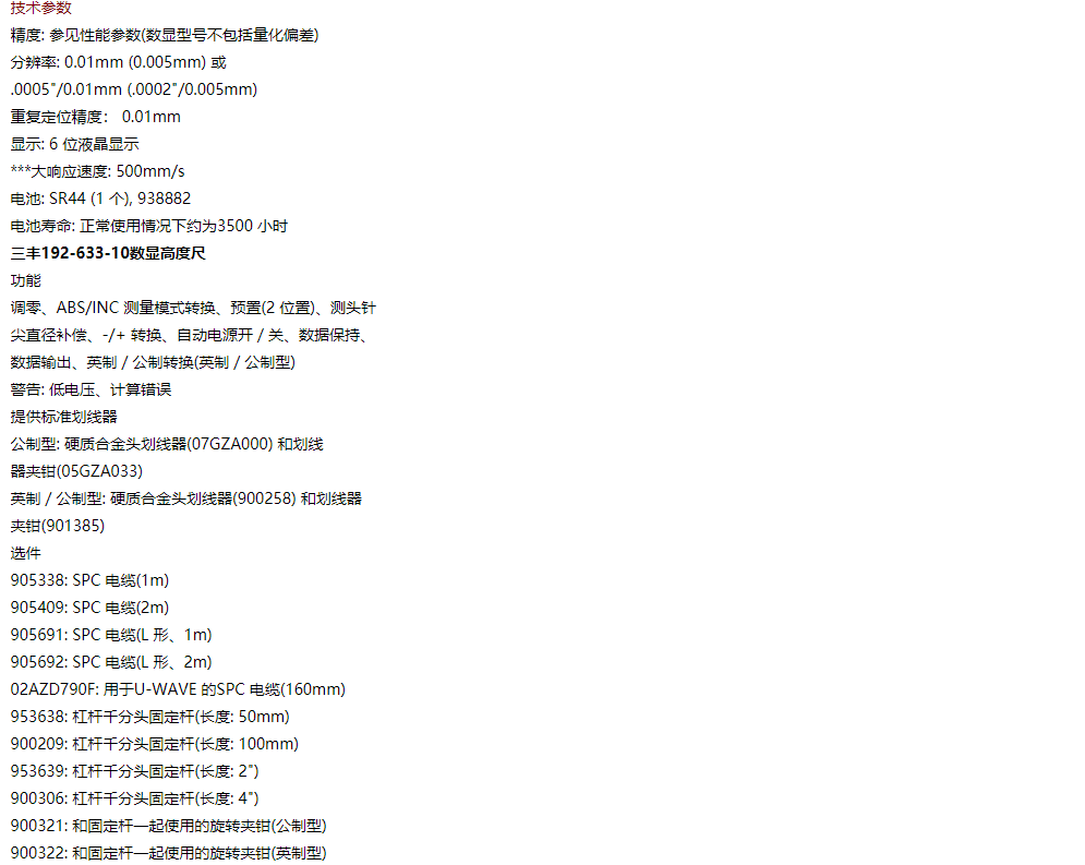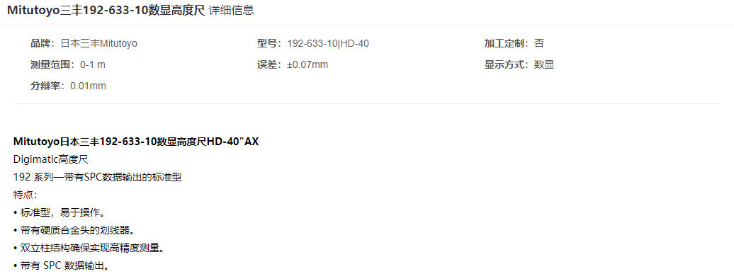 本網頁所展示的有關【三豐 192-633-10數顯高度尺】的信息/圖片/參數等由的會員【日本三豐mitutoyo-深圳柏萊科技有限公司 】提供,由柏萊儀器網-專業銷售儀器儀表服務商-深圳柏萊科技有限公司會員【日本三豐mitutoyo-深圳柏萊科技有限公司 】自行對信息/圖片/參數等的真實性、準確性和合法性負責,本平臺(本網站)僅提供展示服務,請謹慎交易,因交易而產生的法律關系及法律糾紛由您自行協商解決,本平臺(本網站)對此不承擔任何責任。您在本網頁可以瀏覽【三豐 192-633-10數顯高度尺】有關的信息/圖片/價格等及提供 【三豐 192-633-10數顯高度尺】的商家公司簡介、聯系方式等信息。