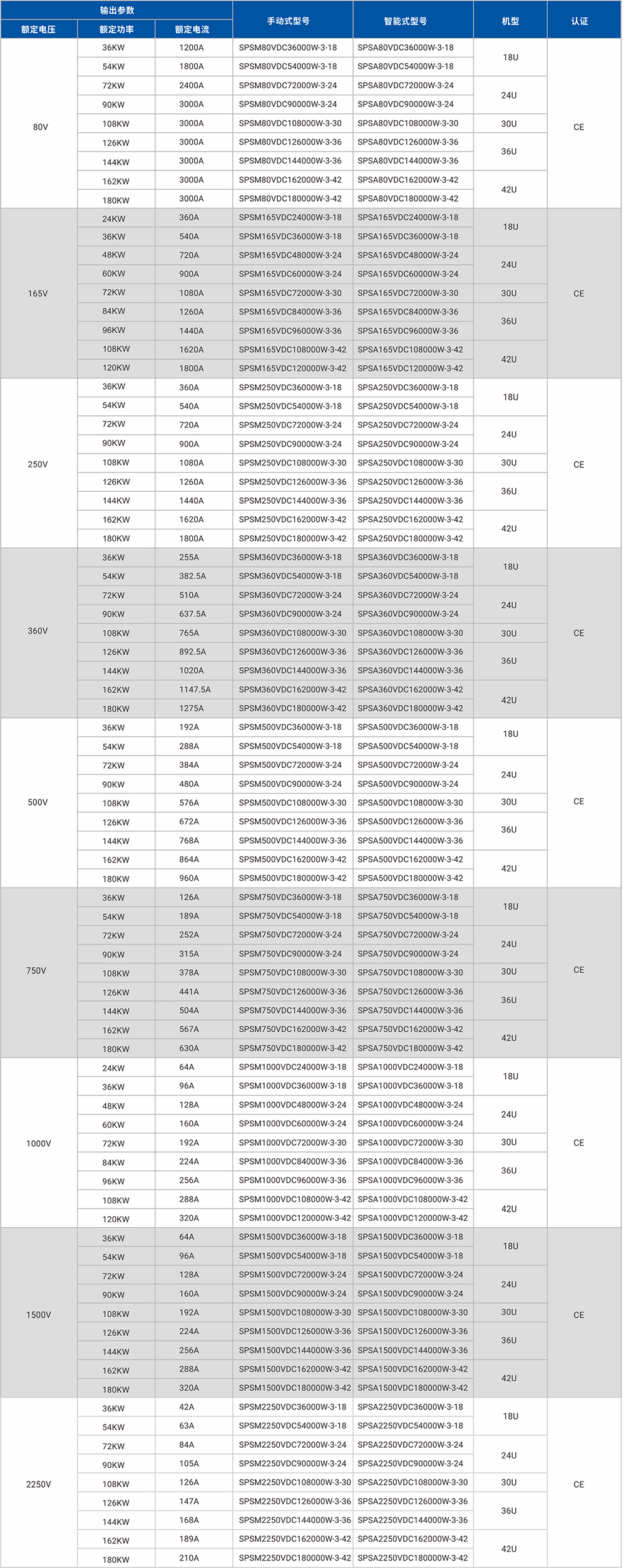 大功率直流電源系統根據控制方式有手動式(SPSM)和智能式(SPSA)兩個系列。單個電源機櫃輸出範圍可達2250V,3000A,180kW。支持多個機櫃主從并聯擴容系統功率可達576kW。