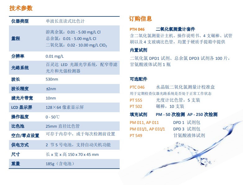 ● 標準DPD 比色法,量程0.01 - 5.00 mg/L;