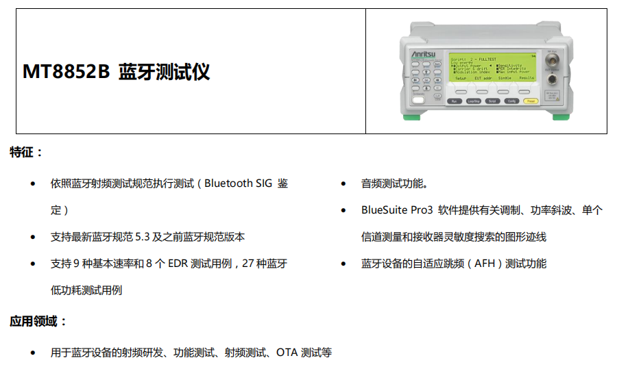 本網頁所展示的有關【MT8852B藍牙測試儀】的信息/圖片/參數等由的會員【日本安立-深圳柏萊科技有限公司 】提供,由柏萊儀器網-專業銷售儀器儀表服務商-深圳柏萊科技有限公司會員【日本安立-深圳柏萊科技有限公司 】自行對信息/圖片/參數等的真實性、準確性和合法性負責,本平臺(本網站)僅提供展示服務,請謹慎交易,因交易而產生的法律關系及法律糾紛由您自行協商解決,本平臺(本網站)對此不承擔任何責任。您在本網頁可以瀏覽【MT8852B藍牙測試儀】有關的信息/圖片/價格等及提供 【MT8852B藍牙測試儀】的商家公司簡介、聯系方式等信息。