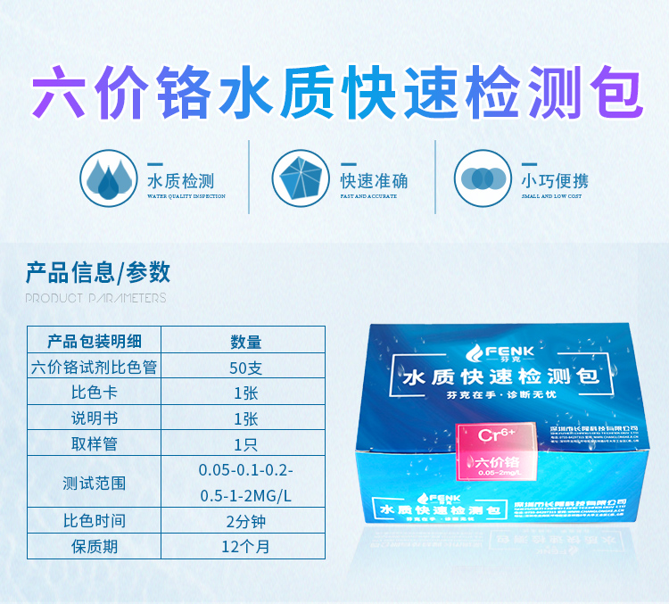 本網頁所展示的有關【六價鉻快速檢測包】的信息/圖片/參數等由的會員【芬克-深圳柏萊科技有限公司 】提供,由柏萊儀器網-專業銷售儀器儀表服務商-深圳柏萊科技有限公司會員【芬克-深圳柏萊科技有限公司 】自行對信息/圖片/參數等的真實性、準確性和合法性負責,本平臺(本網站)僅提供展示服務,請謹慎交易,因交易而產生的法律關系及法律糾紛由您自行協商解決,本平臺(本網站)對此不承擔任何責任。您在本網頁可以瀏覽【六價鉻快速檢測包】有關的信息/圖片/價格等及提供 【六價鉻快速檢測包】的商家公司簡介、聯系方式等信息。