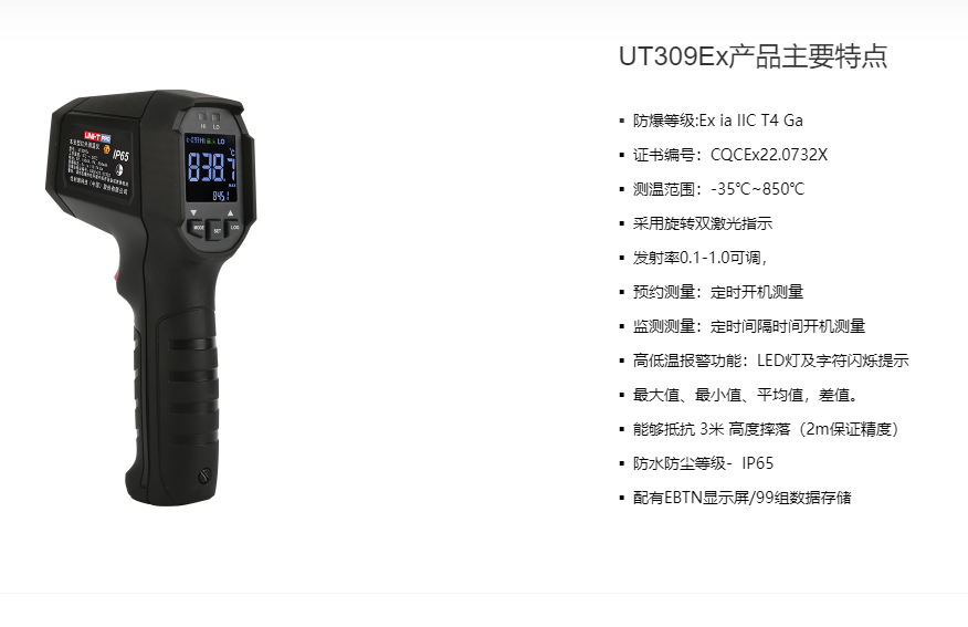 本網頁所展示的有關【防爆紅外測溫儀UT309Ex 優利德 本安型】的信息/圖片/參數等由的會員【優利德-深圳柏萊科技有限公司 】提供,由柏萊儀器網-專業銷售儀器儀表服務商-深圳柏萊科技有限公司會員【優利德-深圳柏萊科技有限公司 】自行對信息/圖片/參數等的真實性、準確性和合法性負責,本平臺(本網站)僅提供展示服務,請謹慎交易,因交易而產生的法律關系及法律糾紛由您自行協商解決,本平臺(本網站)對此不承擔任何責任。您在本網頁可以瀏覽【防爆紅外測溫儀UT309Ex 優利德 本安型】有關的信息/圖片/價格等及提供 【防爆紅外測溫儀UT309Ex 優利德 本安型】的商家公司簡介、聯系方式等信息。