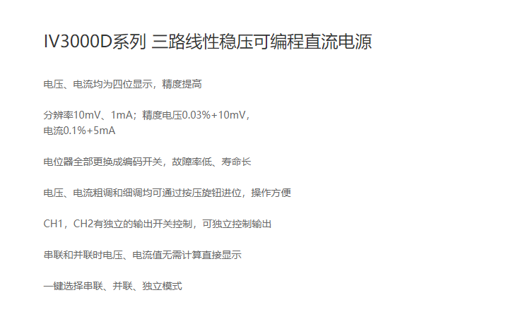 本網頁所展示的有關【三路線性穩壓可編程直流電源IV3000D系列】的信息/圖片/參數等由的會員【艾維泰科-深圳柏萊科技有限公司 】提供,由柏萊儀器網-專業銷售儀器儀表服務商-深圳柏萊科技有限公司會員【艾維泰科-深圳柏萊科技有限公司 】自行對信息/圖片/參數等的真實性、準確性和合法性負責,本平臺(本網站)僅提供展示服務,請謹慎交易,因交易而產生的法律關系及法律糾紛由您自行協商解決,本平臺(本網站)對此不承擔任何責任。您在本網頁可以瀏覽【三路線性穩壓可編程直流電源IV3000D系列】有關的信息/圖片/價格等及提供 【三路線性穩壓可編程直流電源IV3000D系列】的商家公司簡介、聯系方式等信息。