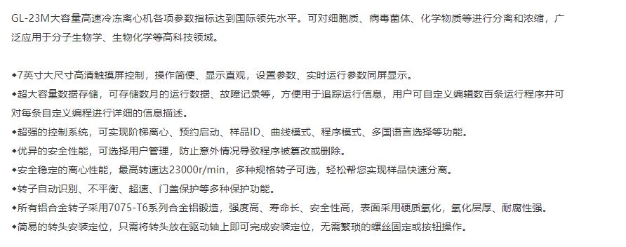 本網頁所展示的有關【GL-23M大容量高速冷凍離心機】的信息/圖片/參數等由的會員【湘儀cence-深圳柏萊科技有限公司 】提供,由柏萊儀器網-專業銷售儀器儀表服務商-深圳柏萊科技有限公司會員【湘儀cence-深圳柏萊科技有限公司 】自行對信息/圖片/參數等的真實性、準確性和合法性負責,本平臺(本網站)僅提供展示服務,請謹慎交易,因交易而產生的法律關系及法律糾紛由您自行協商解決,本平臺(本網站)對此不承擔任何責任。您在本網頁可以瀏覽【GL-23M大容量高速冷凍離心機】有關的信息/圖片/價格等及提供 【GL-23M大容量高速冷凍離心機】的商家公司簡介、聯系方式等信息。