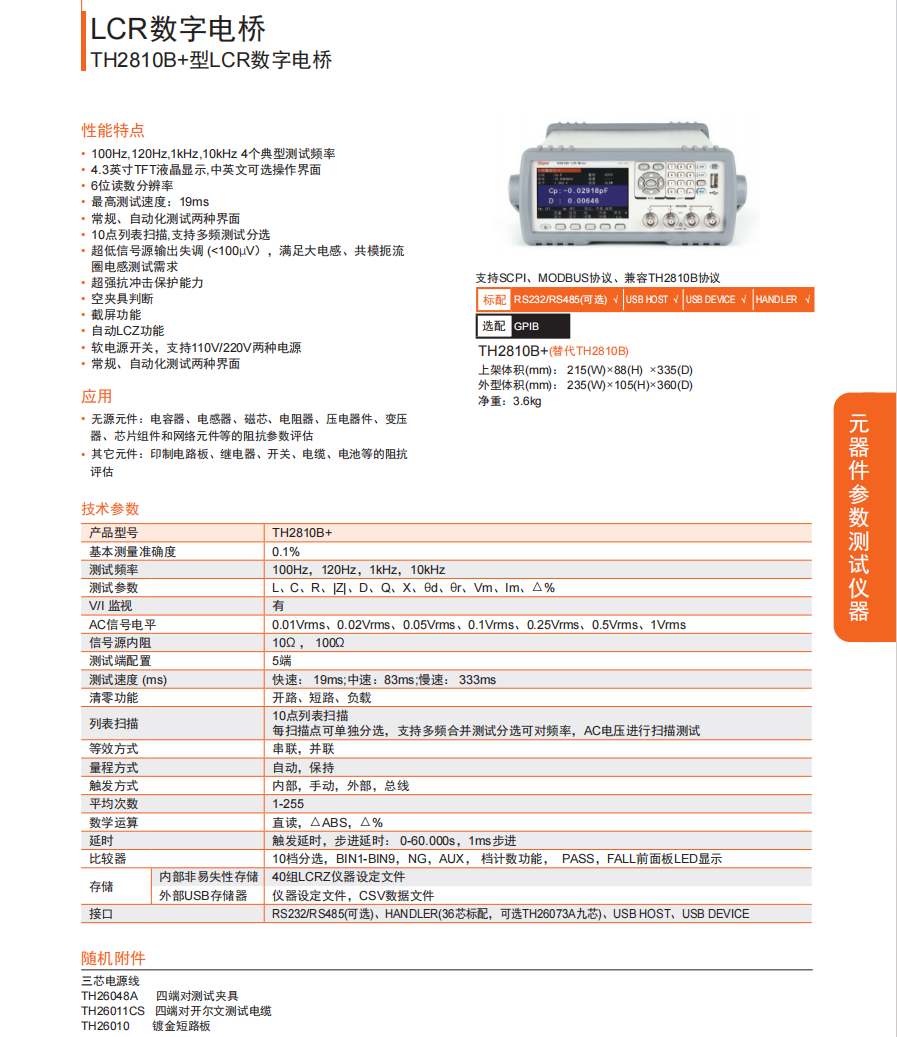 本網頁所展示的有關【TH2810B+型LCR數字電橋】的信息/圖片/參數等由的會員【同惠電子 -深圳柏萊科技有限公司 】提供,由柏萊儀器網-專業銷售儀器儀表服務商-深圳柏萊科技有限公司會員【同惠電子 -深圳柏萊科技有限公司 】自行對信息/圖片/參數等的真實性、準確性和合法性負責,本平臺(本網站)僅提供展示服務,請謹慎交易,因交易而產生的法律關系及法律糾紛由您自行協商解決,本平臺(本網站)對此不承擔任何責任。您在本網頁可以瀏覽【TH2810B+型LCR數字電橋】有關的信息/圖片/價格等及提供 【TH2810B+型LCR數字電橋】的商家公司簡介、聯系方式等信息。